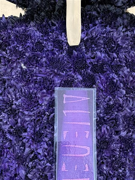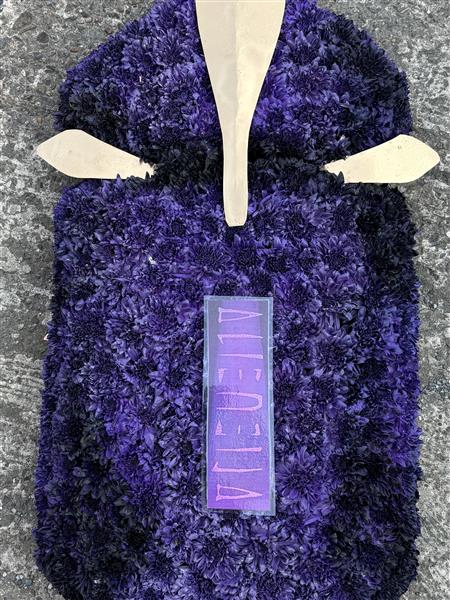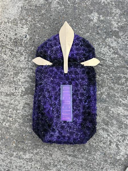 Alien perfume tribute - white chrysanthemums base spray painted purple and completed with logo.