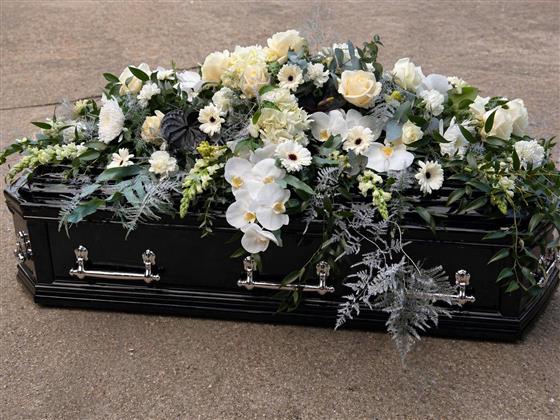 This stunning tribute drapes naturally over the casket, with trailing foliage and silvery fern cascading gracefully down the sides, making a truly memorable and distinguished farewell.