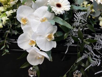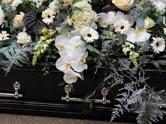 A breathtaking and luxurious casket spray in a soft palette of white, cream, black, silver and sage green. This generously sized arrangement cascades beautifully across the coffin lid, creating a lush, natural garden feel that speaks of grace, peace, and dignity.
