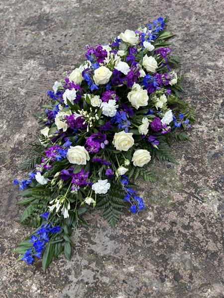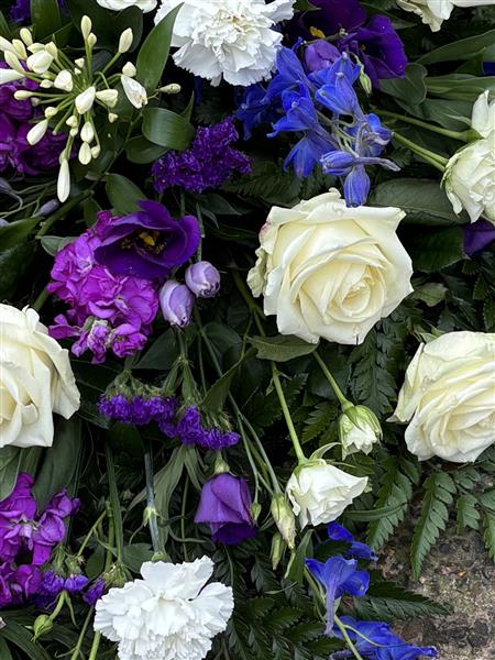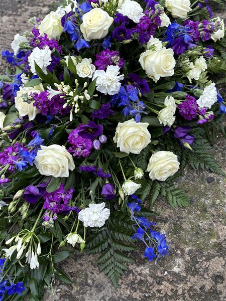 A minimal casket spray featuring deep blue Delphinium, Agapanthas, Whote roses & Phlox accompanied with seasonal greenry.