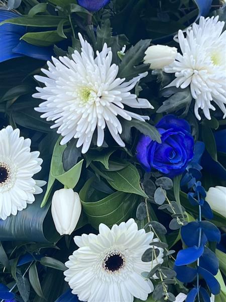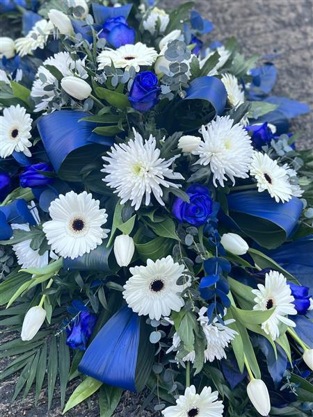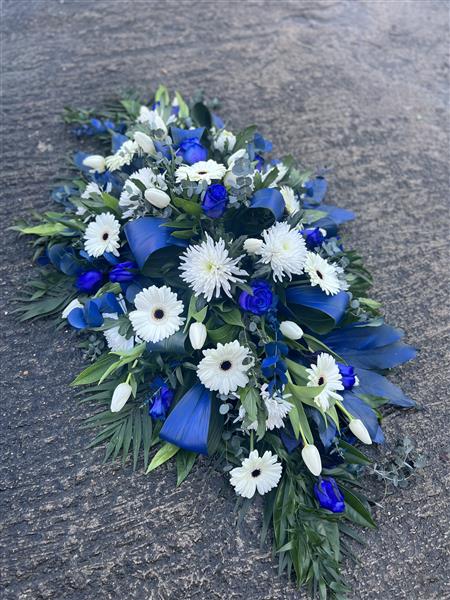 Casket tribute using a mixture of blue and white flowers, with blue sprayed leaves.