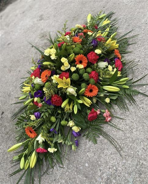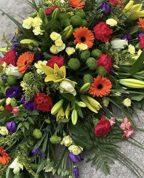 A vibrant mix of seasonal flowers featuring roses, lilies, carnations complemented with foliage and fillers. You can personalise this tribute by adding your loved ones favourite flowers please contact us.