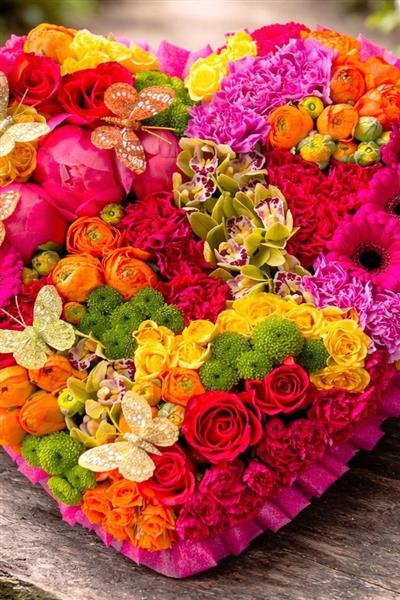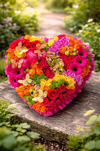 A stunning heart-shaped floral tribute bursting with colour and life. This bold arrangement features hot pink peonies, gerberas, and carnations alongside orange and red roses, ranunculus, yellow spray roses, and green button chrysanthemums. Delicate orchid blooms add an exotic touch, while decorative gold and orange butterfly accents bring a whimsical, celebratory feel. Edged with deep pink ribbon frilling, this tribute is perfect for celebrating a vibrant, joyful life.