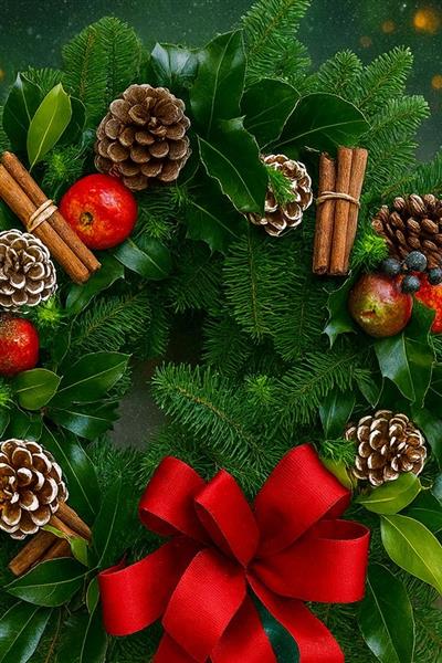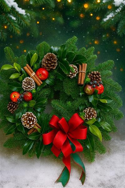 This traditional holiday wreath captures the timeless beauty of a classic Christmas with its lush arrangement of fresh evergreen foliage, glossy holly leaves, and fragrant pine branches. Artfully decorated with natural frosted pinecones, aromatic cinnamon stick bundles, and jewel-toned red apples accented with clusters of berries, this wreath brings warmth and festive charm to any door or wall. The rich textures and seasonal scents create an inviting welcome for guests, while the elegant red satin bow adds a touch of refined holiday elegance. Perfect for celebrating cherished traditions and filling your home with the nostalgic spirit of Christmas