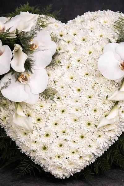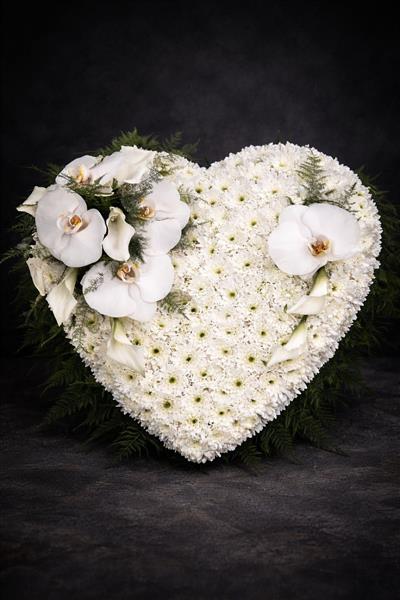 A beautifully pure and elegant heart tribute, densely covered in white chrysanthemums and adorned with stunning white phalaenopsis orchids and calla lilies. Finished with soft fern foliage, this serene tribute is a heartfelt expression of love and loss.