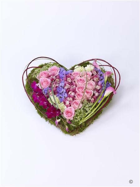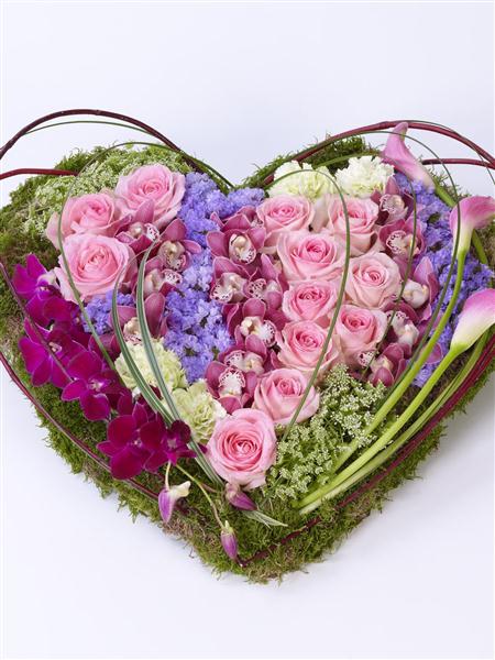 This heart-shaped design including large-headed roses, carnations and cymbidium and dendrobium orchids is given a contemporary feel with sweeping pink calla Lily, cornus and steel grass.