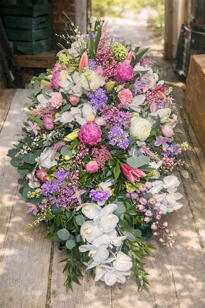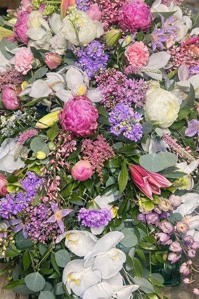 A lush, abundant casket spray bursting with colour and life. Filled with peonies, tulips, lilac, clematis, carnations and white orchids, all set amongst generous trails of eucalyptus and fresh foliage. A truly romantic and garden-inspired tribute full of natural beauty.