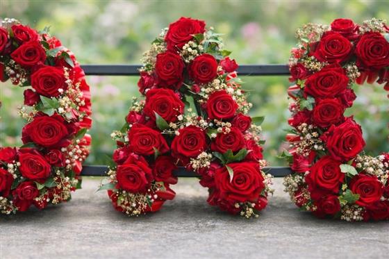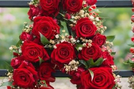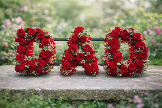 A deeply personal and heartfelt funeral tribute spelling out DAD in bold floral lettering. Each letter is densely packed with rich, velvety red roses and delicately accented with gypsophila (baby’s breath) and trailing ivy, creating a classic and timeless look. Edged with deep red ribbon frilling, this tribute stands as a powerful final expression of love and respect.