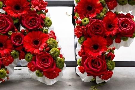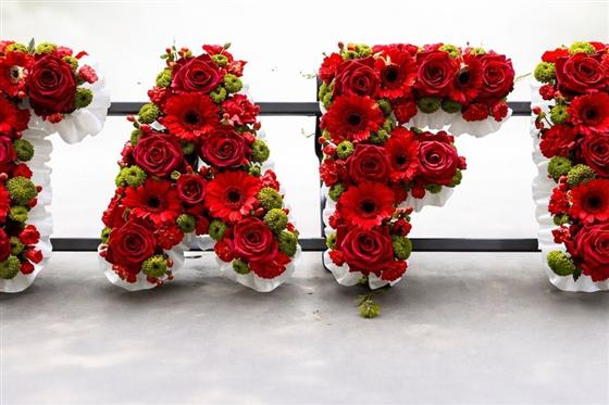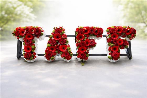 A striking personalised letter tribute spelling out TAFF, densely packed with vibrant red roses, gerberas, and green button chrysanthemums. Edged with a classic white ruffled border, this bold and colourful tribute is a wonderful way to honour a loved one by name or nickname.