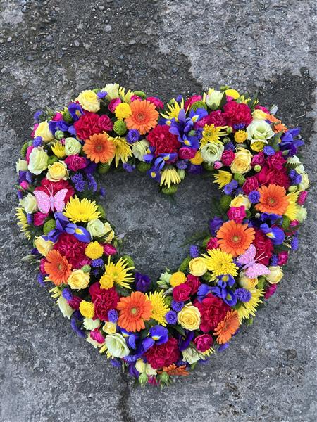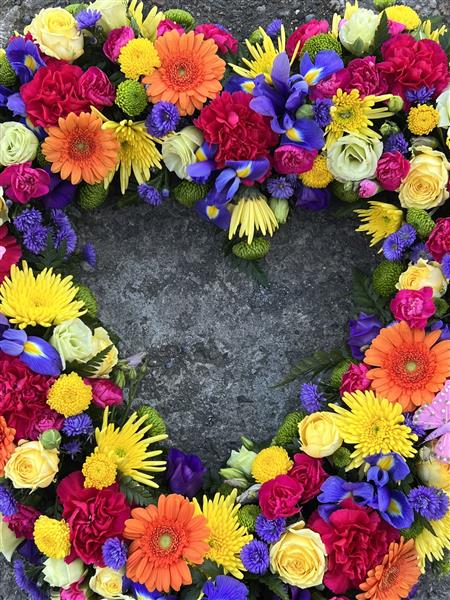 Dotted design open heart featuring seasonal flowers in vibrant colours.