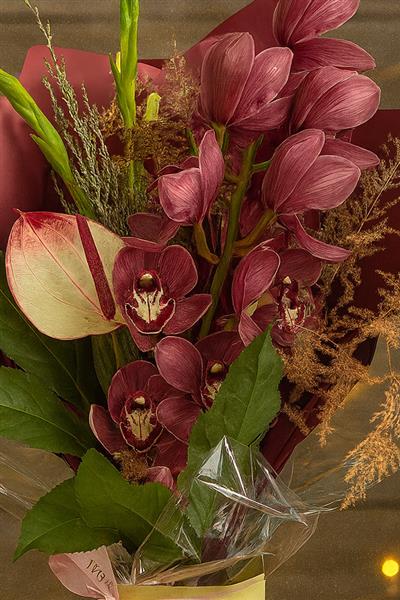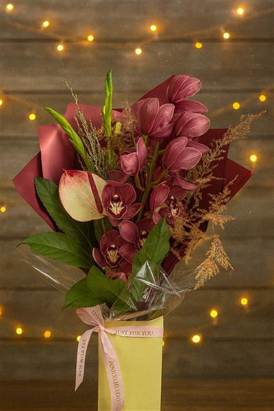 This sophisticated bouquet features a tall cascade of pristine pink orchids accented with deep pink speckles, creating an effortlessly luxurious look. Complemented by a single pink anthurium, fresh green stems, and airy textured foliage, the arrangement brings a touch of natural elegance to any space. Wrapped in luxury burgundy paper and tied with a satin ribbon, this bouquet is perfect for celebrations, heartfelt gestures, or simply brightening someoneβs day with refined beauty.