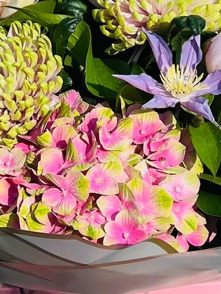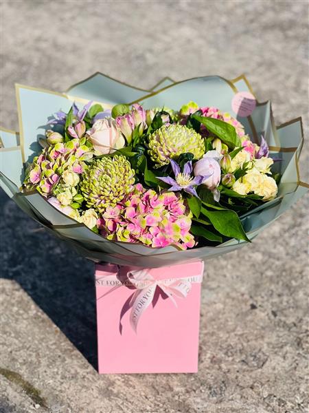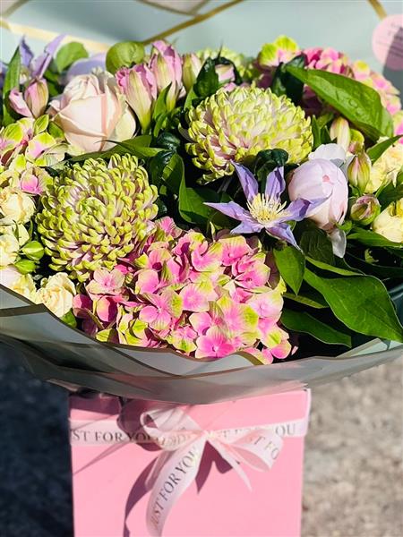 A luxury mix of fresh pastel flowers - gesturing Peonyβs, Hydrangeas, Roses with seasonal greenery.