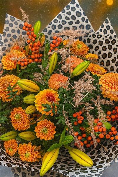 Bursting with fiery oranges, rich berries, textured grasses and striking lilies, this arrangement is wrapped in fierce leopard-print for a look that’s unapologetically bold.