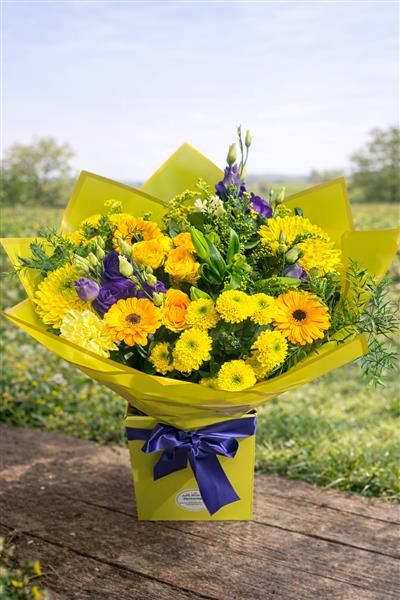 Brighten anyone’s day with this radiant hand-tied bouquet, bursting with cheerful sunshine yellows and rich purple accents, beautifully presented in vibrant yellow wrapping.
