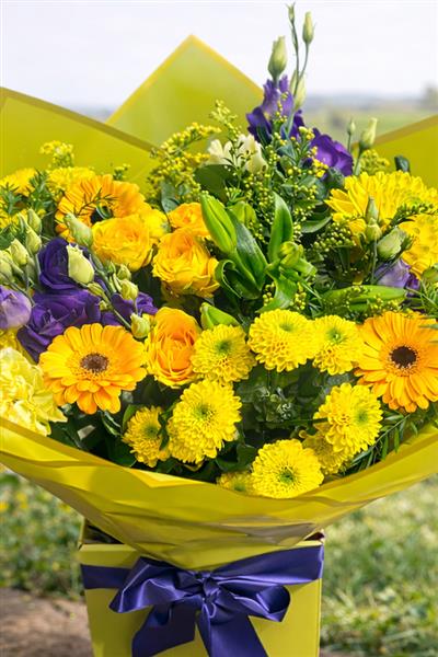 A full, generous bouquet that radiates warmth and happiness. Our florists create an abundant arrangement combining multiple shades of yellow from soft butter to deep gold, with striking purple blooms adding depth and contrast. The mix of different flower shapes creates wonderful texture and visual interest.