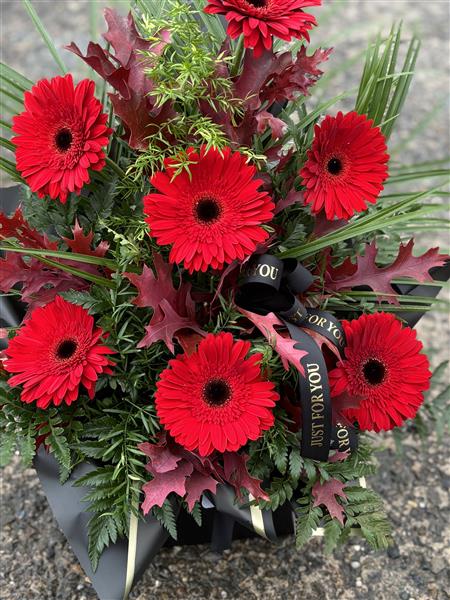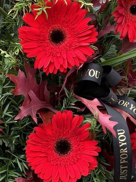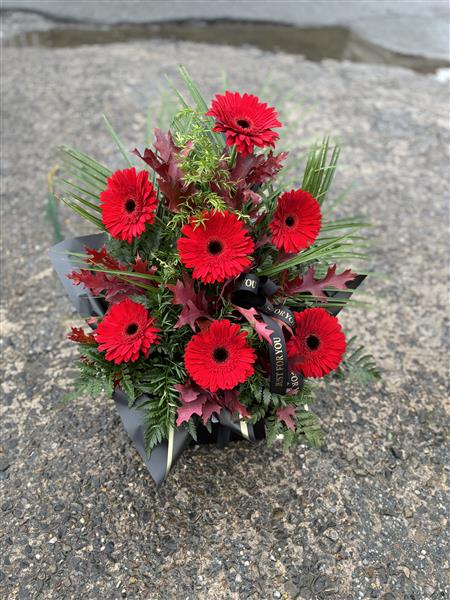 A striking floral arrangement featuring bold red gerbera daisies, beautifully arranged in oasis for long-lasting freshness. Accented with lush greenery and deep-toned foliage, this display is perfect for expressing heartfelt sentiments or adding a vibrant touch to any setting. Designed in a modern, structured style, this arrangement sits neatly in its base, making it suitable for a variety of occasions including sympathy, memorials, or as a thoughtful gift.