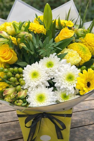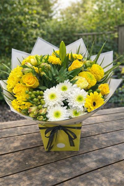 Packed with yellow roses, yellow gerberas, white spray chrysanthemums with lime green centres, yellow alstroemeria, yellow carnations, a lily bud, green hypericum berries and fresh mixed foliage.