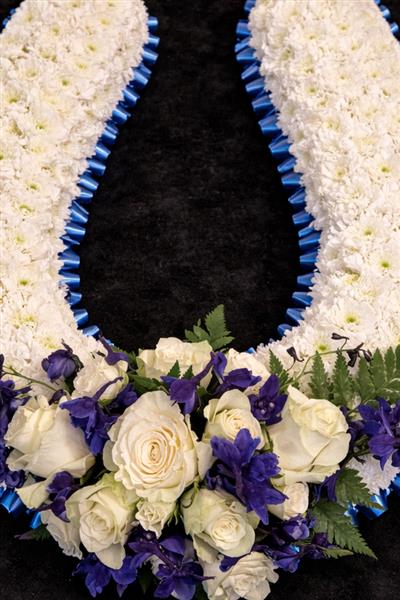 The horseshoe form is generously massed in pure white chrysanthemums, creating a full, lush and immaculate finish throughout. The entire outer and inner edges are dressed with neatly pleated royal blue ribbon, adding a bold and elegant definition to the shape and giving the tribute a beautifully polished, professional finish.