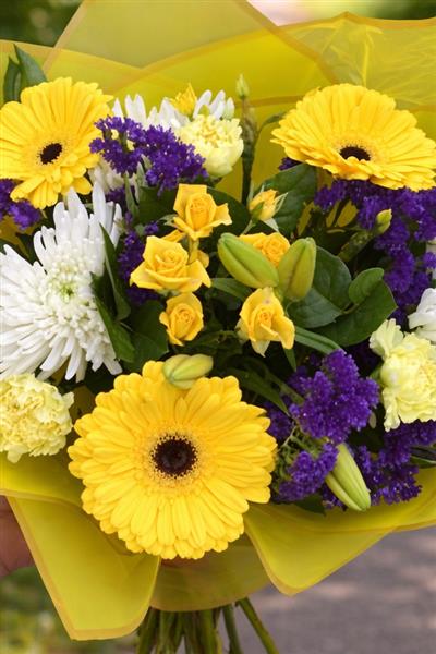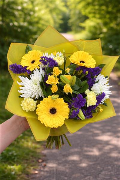 A classic tricolor combination that never fails to impress. Our florists create a full, rounded bouquet with bright yellow blooms taking center stage, beautifully balanced with fresh white flowers and deep purple accents. The variety of flower shapes and textures creates visual interest and a professional finish.