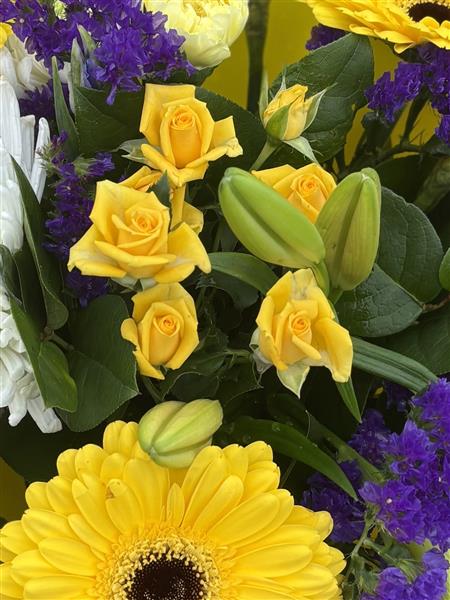 Please note: As this is a floristโs choice arrangement, the specific flowers may vary based on seasonal availability, but the quality, generous size, and beautiful yellow, white, and purple color palette will always be maintained.