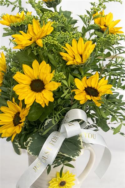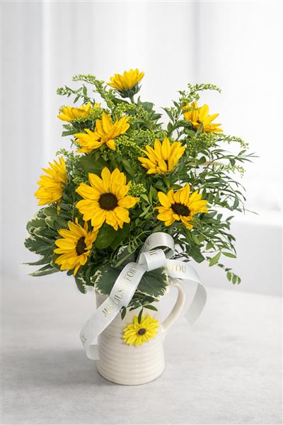 A generous armful of vivid golden sunflowers is arranged in a charming cream ceramic ribbed jug, complemented beautifully by: