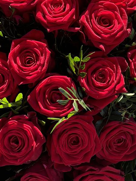 This is a beautifully arranged bouquet of 50 red roses. The roses are tightly clustered together in a rounded dome shape, giving the arrangement a very full and lush appearance. The petals are rich, velvety red, symbolizing deep love and passion.