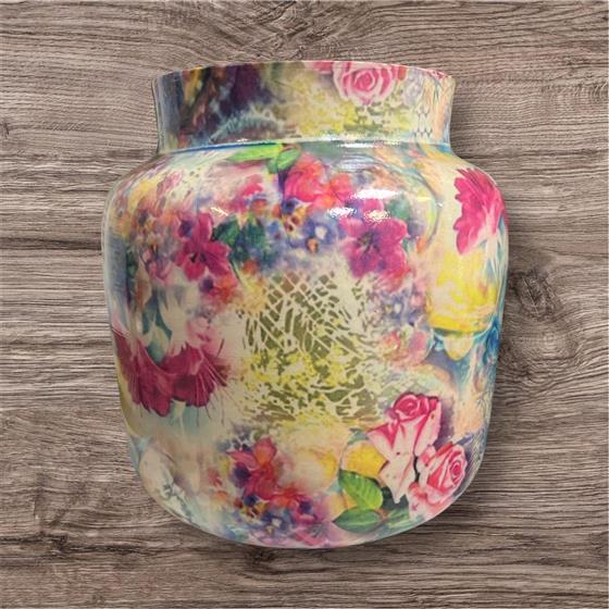 Bring vibrant color and cottage charm to your space with this eye-catching decorative tin vase. Adorned with a lush collage of blooming flowers, this piece is both functional and artful, adding instant personality to any room.