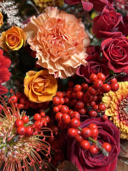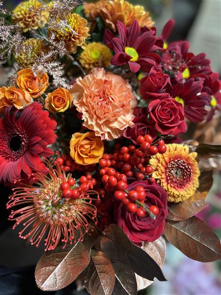 By trusting our Florist’s Choice selection, you’re giving our expert designers the freedom to choose the freshest, most vibrant warm-toned blooms available that day. This guarantees a premium quality arrangement bursting with the rich, jewel-like colors of autumn at their absolute peak.