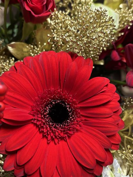 This designer’s choice bouquet showcases the finest seasonal flowers in a sophisticated holiday palette. Expect to see rich red roses and gerberas as focal points, complemented by delicate white accent flowers and sparkling golden dried or painted elements that add texture and festive elegance. Each arrangement is artfully hand-tied by our skilled florists, ensuring every bouquet is a unique creation.