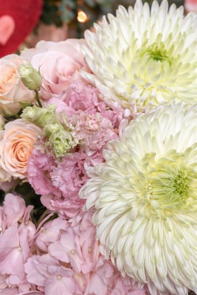 Let our expert florists work their magic! This dreamy hand-tied bouquet showcases the finest seasonal blooms in a soft, romantic palette of warm peach tones, delicate pinks, and crisp whites. Each arrangement is thoughtfully crafted with the freshest flowers of the season, which may include elegant roses, stunning chrysanthemums, charming spray roses, ruffled lisianthus, soft carnations, and more seasonal favorites.
