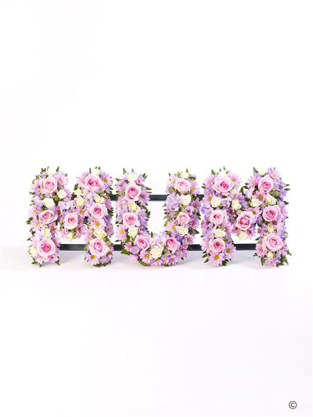 A mass of spray chrysanthemums, freesias, roses, spray roses and September flower in white, lilac and pink is used to create this Mum tribute.