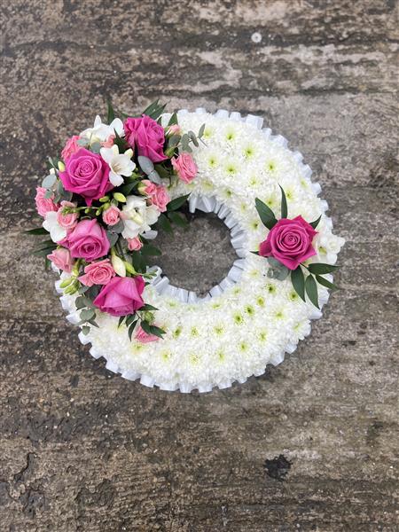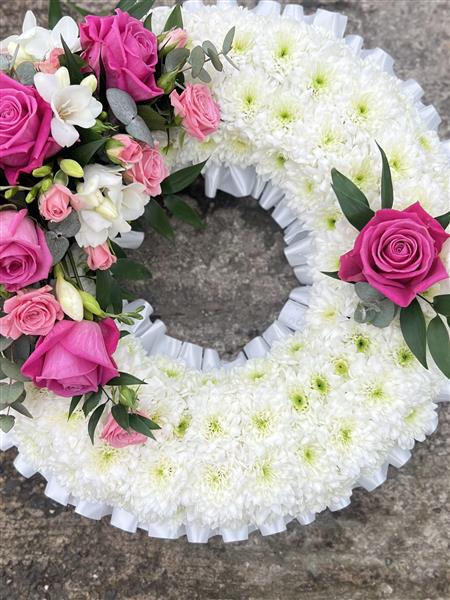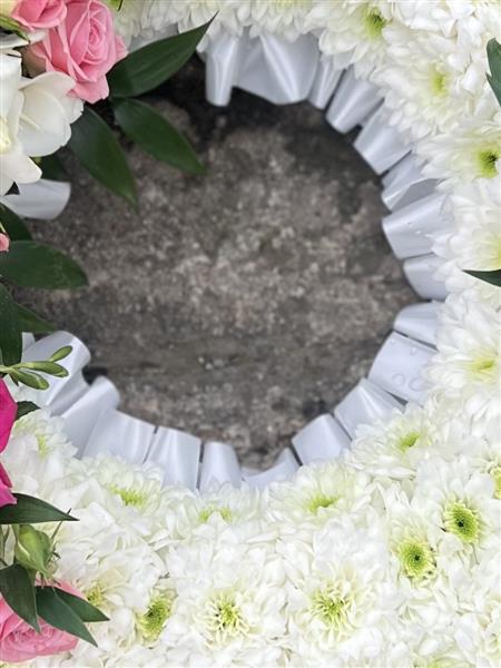 Massed wreath in white chrysanthemums, featuring pale pink roses in the corsage.