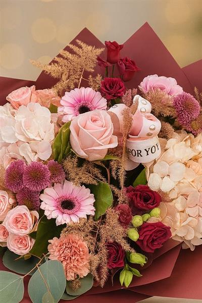 Soft, romantic, and beautifully arranged, this bouquet blends delicate pastels with rich berry tones for an unforgettable look. Large hydrangea blooms in creamy blush shades pair perfectly with pink roses, gerberas, carnations, and charming mini spray roses. Accents of deep burgundy florals and airy dried textures add depth and a touch of luxury. Wrapped in stylish burgundy paper, this bouquet is the perfect gift for birthdays, anniversaries, celebrations, or simply reminding someone how special they are.