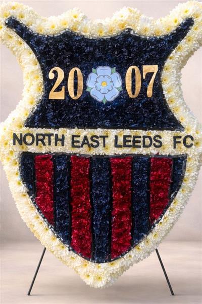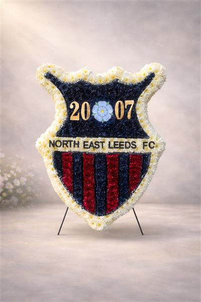 Recreated in stunning detail, this life-sized football club badge has been meticulously crafted in flowers to perfectly replicate the North East Leeds FC crest. The bold navy and red striped lower section is brought to life using deep blue and red chrysanthemums, while the upper section features the club’s iconic Yorkshire rose and year “2007” picked out in gold lettering. The entire badge is bordered with a crisp edge of cream and white chrysanthemums, giving it a beautifully clean and striking finish.