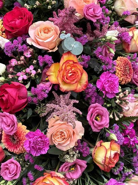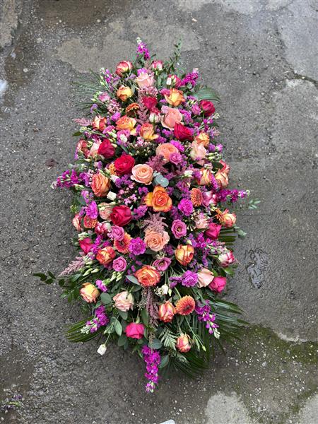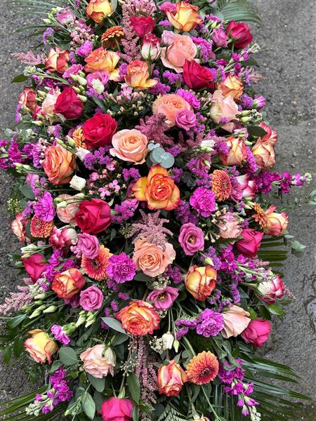 A luxury casket tribute featuring cerise, orange and peach roses. The very best cerise Italian stocks, Astilbe, Bouvardia, accompanied with seasonal greenry. This truly stunning casket is shown in the picture is the large size and would fully fill the casket.