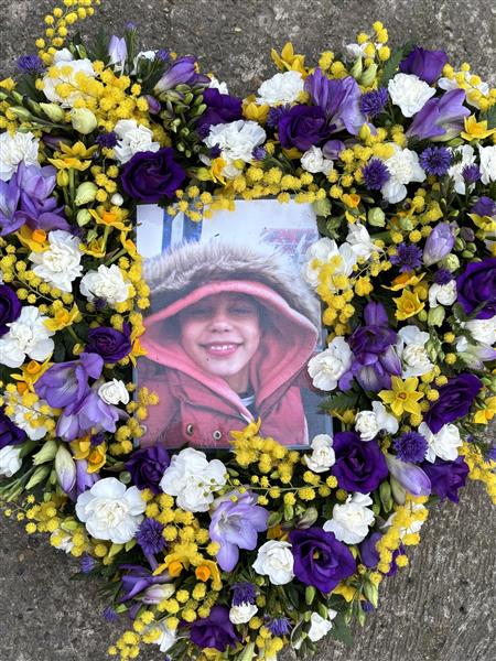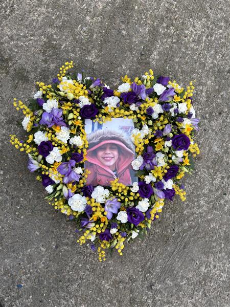 Personalised heart tribute which photo of loved one in the middle surrounded by flowers in your choice of colours. Finished with ribbon edging.