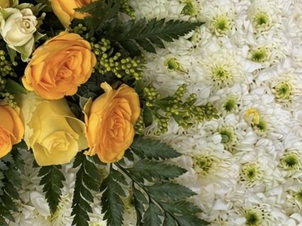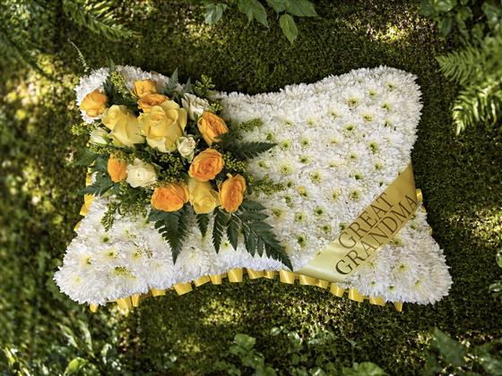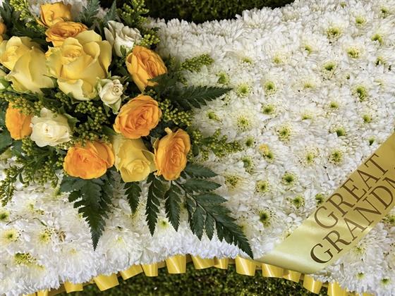 A soft and serene pillow tribute densely covered in white chrysanthemums, edged with a yellow ribbon and adorned with a spray of golden yellow roses, lisianthus and mimosa with fresh fern foliage. Finished with a personalised gold โGreat Grandmaโ sash, this gentle and loving tribute is a perfect farewell to a truly treasured great grandmother