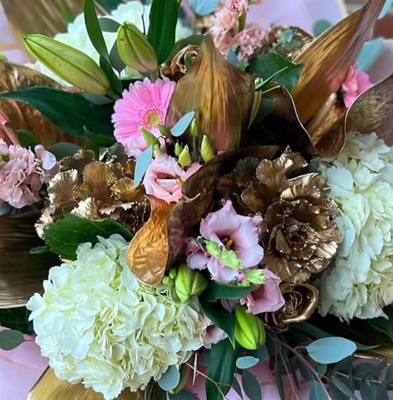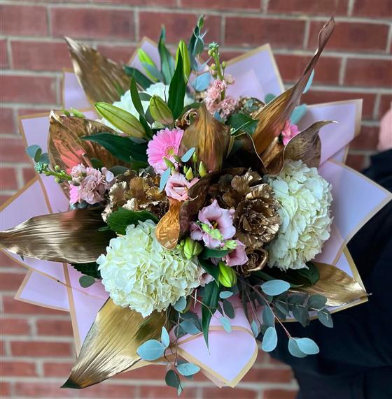 To give this bouquet a luxurious finish, the florist has included gold-painted leaves and shimmering gold foliage, making it an ideal choice for weddings, anniversaries, special celebrations, or as a statement gift. Wrapped in stylish pink and gold paper, this arrangement is sure to impress and bring joy to any occasion.