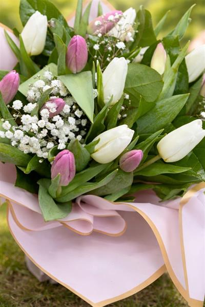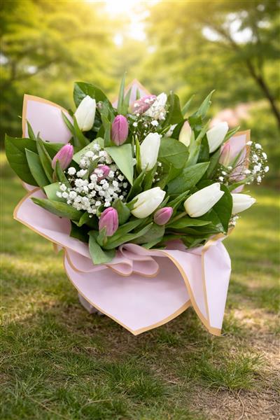This elegant hand-tied bouquet features a soft, romantic palette of white and pink tulips accented with delicate baby’s breath. The combination creates a classic, timeless look that’s perfect for any special occasion.