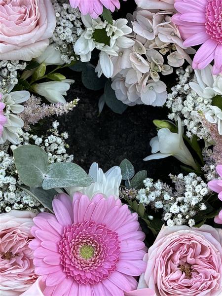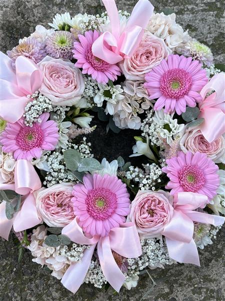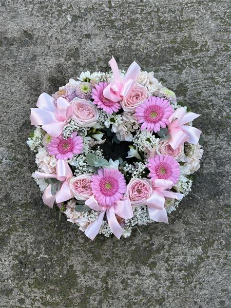 All pink wreath made with seasonal flowers and foliage finished off with pretty pink ribbons.