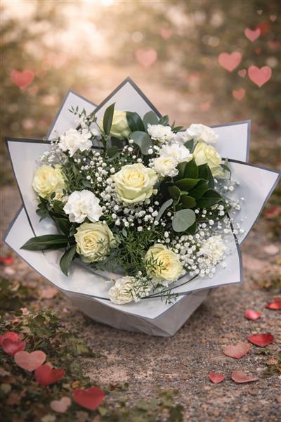 Featuring creamy white roses, delicate white carnations, and clouds of gypsophila (baby’s breath), each stem is thoughtfully arranged with lush eucalyptus and mixed foliage to create a dreamy, romantic feel. The gentle combination of whites and soft greens symbolizes pure love, devotion, and new beginnings.