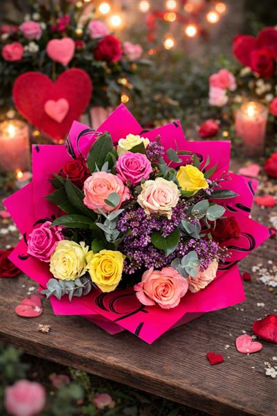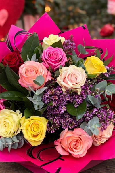 Why choose one color when you can have them all? This vibrant celebration of color brings pure joy with every petal! Bursting with energy, this stunning arrangement features a gorgeous mix of sunny yellow, passionate red, playful hot pink, soft blush, and peachy coral roses that create an unforgettable rainbow effect. Rich purple waxflower adds depth and drama, while fresh eucalyptus ties it all together. The bold hot pink wrapping with striking black brushstroke details makes this bouquet impossible to ignore!