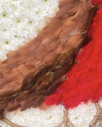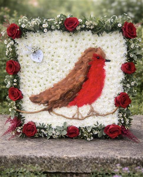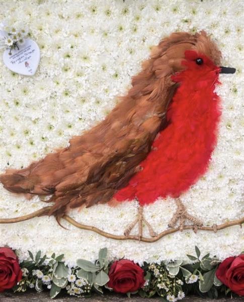 This stunning bespoke funeral tribute features a beautifully detailed robin redbreast, lovingly created as a centrepiece on a lush bed of tightly packed white chrysanthemums. The robin — a beloved symbol of remembrance and the presence of a loved one — is intricately crafted using rich brown and vivid red feathers, perched upon a delicate natural twig, bringing a lifelike warmth and tenderness to the piece.