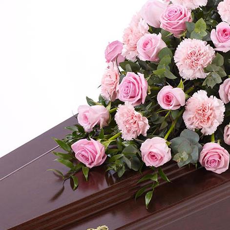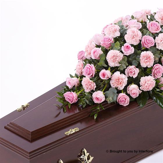 Large-headed pink Rose combine with pink carnations and luxurious foliages to create this traditional casket spray. Approximate height 92cm (3ft).