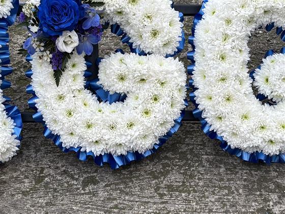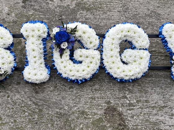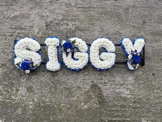 Siggy massed letters, blue ribbon edge white lettering and complimented with blue corsages.
