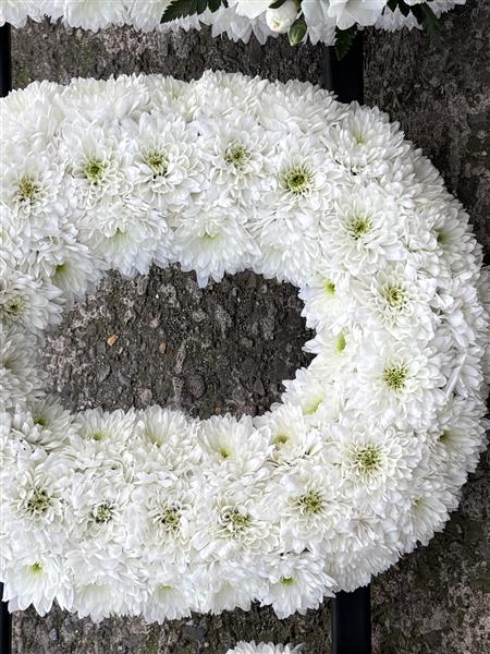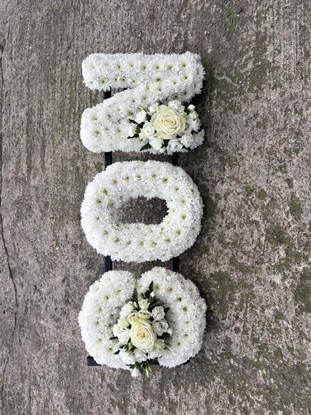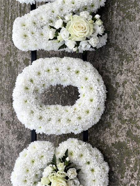 SON lettering made with no ribbon white massed letting and corsage to match.