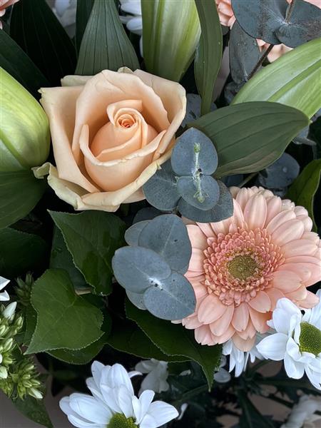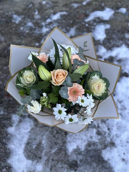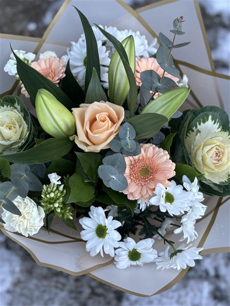 A beautifully arranged hand-tied bouquet featuring a soft blend of cream roses, peach carnations, delicate lilies, and cheerful white daisies. Accented with lush greenery and wrapped in stylish neutral-toned paper, this bouquet is perfect for any occasion – from birthdays and anniversaries to a simple gesture of love and appreciation. Fresh, elegant, and timeless