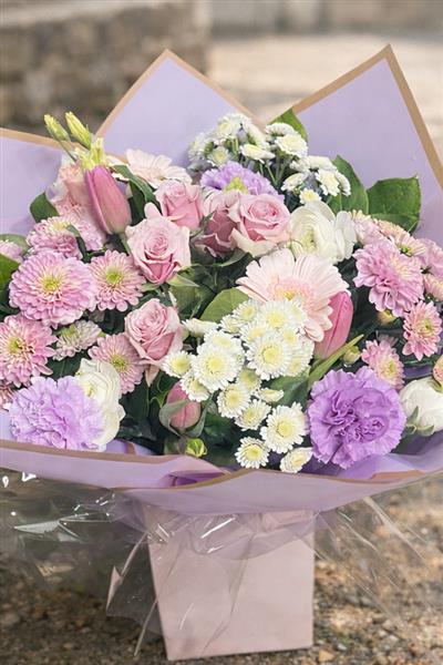 A generous, rounded bouquet bursting with blooms in soft pinks, lilacs, and whites. Our florists create a full, abundant arrangement that combines different flower shapes and sizes for maximum visual impact and texture.