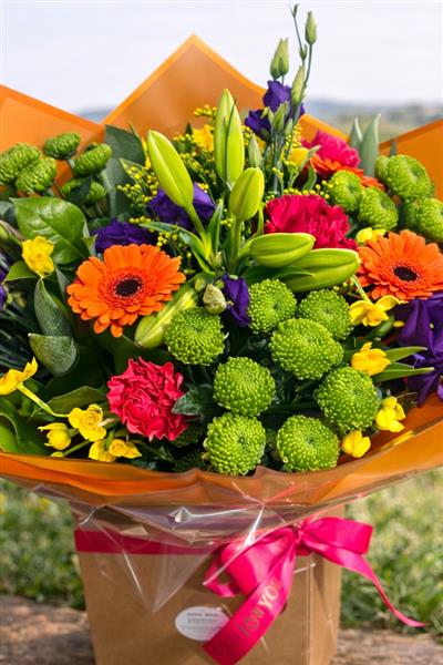 Make a bold statement with this spectacular hand-tied bouquet, exploding with vibrant colors and energy - a true celebration of spring in every sense.