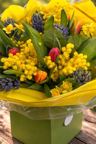 Bright spring bouquet with mixed tulips in red, orange and yellow, fluffy yellow mimosa, blue hyacinths, and seasonal blooms with fresh green foliage. Presented in bold yellow wrap and a green box for a fresh, happy lookโperfect for birthdays, spring gifts, and cheerful surprises.